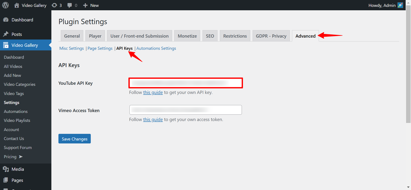 Paste it into the YouTube API Key field in the All-in-One Video Gallery settings, and click the Save Changes button.