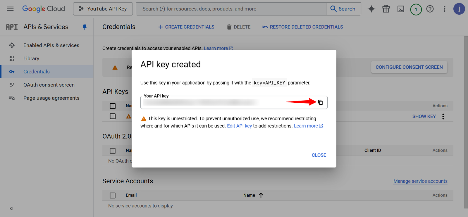 Wait for a few moments for the API key to be created. Then, copy the generated API Key.