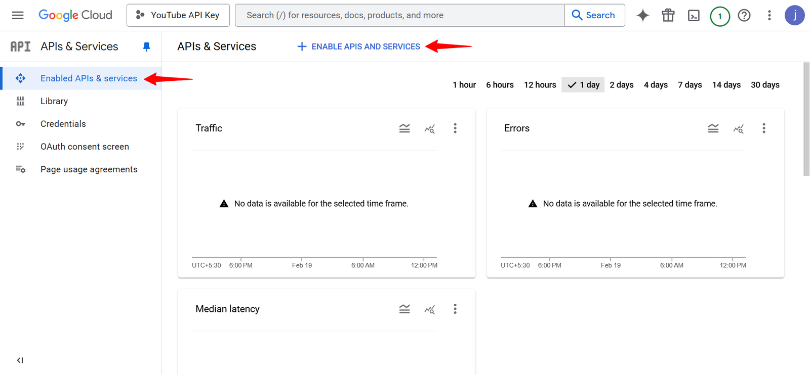 So, we still need to head over to the Enabled APIs & Services tab in the Cloud Console menu and choose the ENABLE APIS AND SERVICES option.
